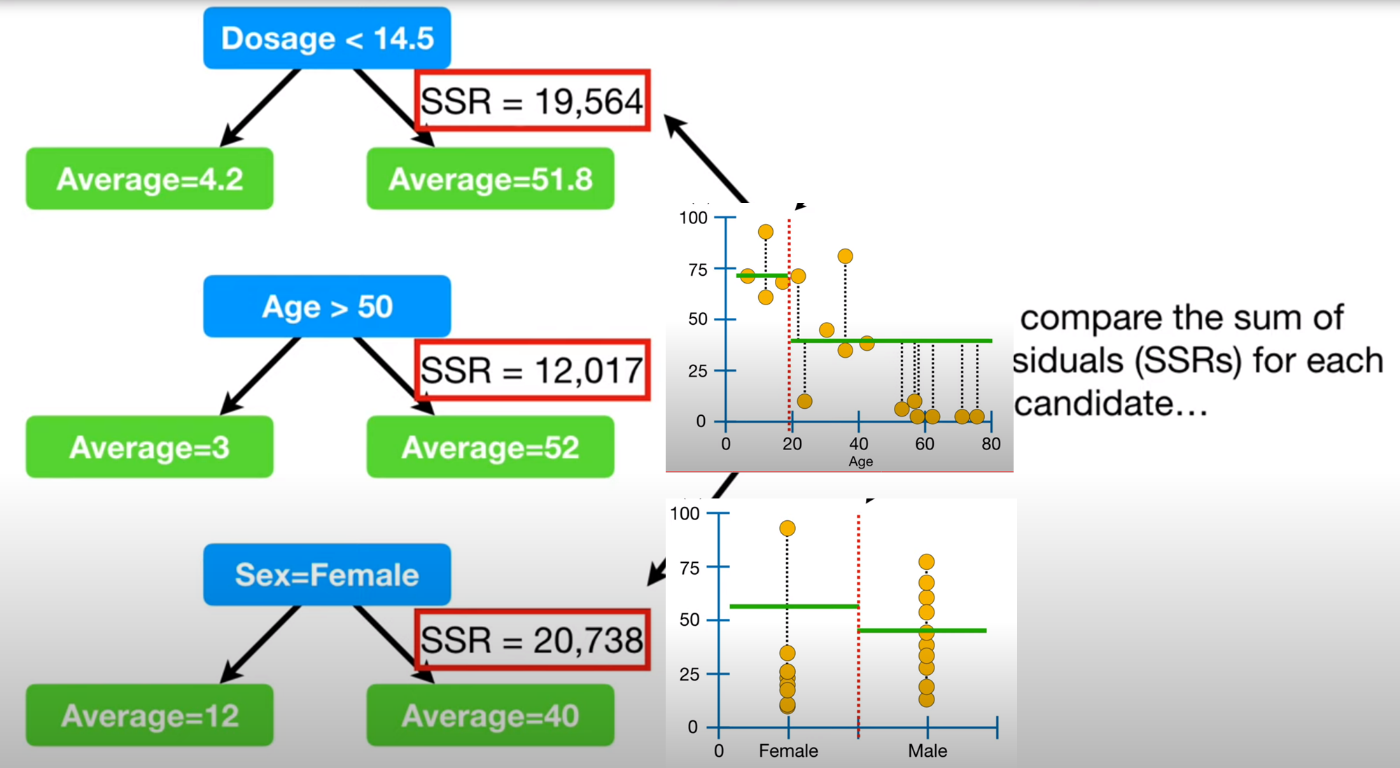 범주형 변수일떄는 sex의 경우처럼 , 연속형 변수나 순서형 변수는 1번의 경우처럼 가장 낮은 ssr을 가지는 threshold를 선택하여 변수에 맞는 질문을 만들고 그 질문끼리 가장작은 질문을 우선 순위로하여 트리를 구성하여 트리를 완성한다.
