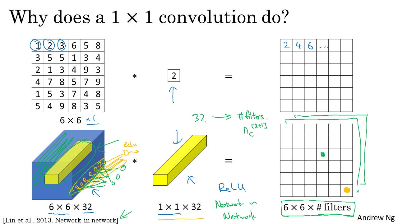 위의 그림을 예를들어 1x1conv의 계산과정을 보면 각 channel마다 1x1x32의 값이 곱해저 6x6x32의 output을 내게 된다.