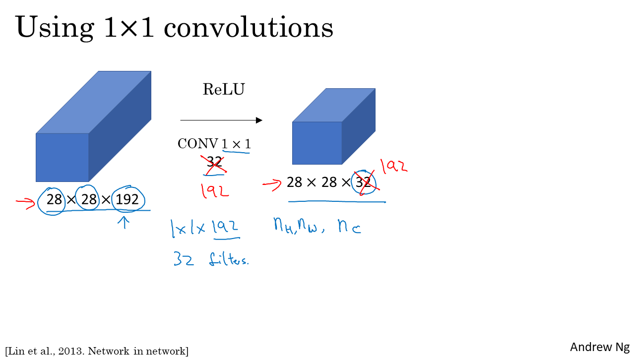 만약 위의 예처럼 192개의 채널이 너무 크다 싶으면 1x1x32필터를 이용하여 채널을 줄일 수 있다.