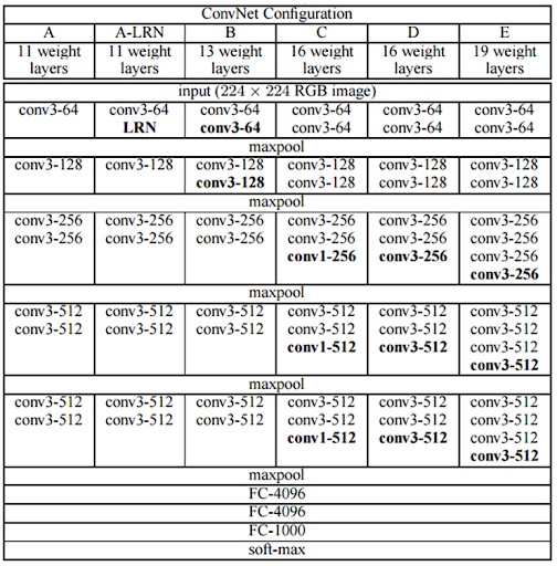 vgg net은 총 6가지의 모델이 있는데 가장 우측의 2가지 vgg-16, vgg19를 주로 사용한다고 한다. (성능면에서 )