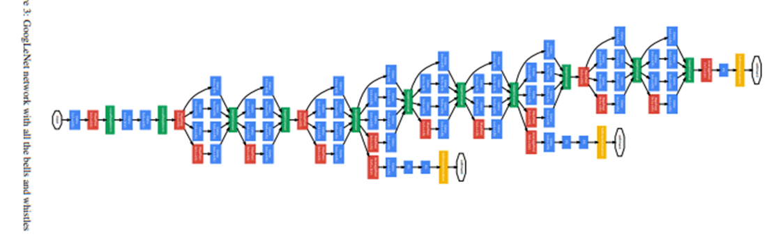 위에서 보았던 인셉션 모듈을 여러개 스태킹한 모습을 보이고 중간중간에 미리 결과를 냐는 auxiliary classifiers 를 두어 추후에 가중치를 곱한후 더하여 로스를 계산하고 다시 학습한다.