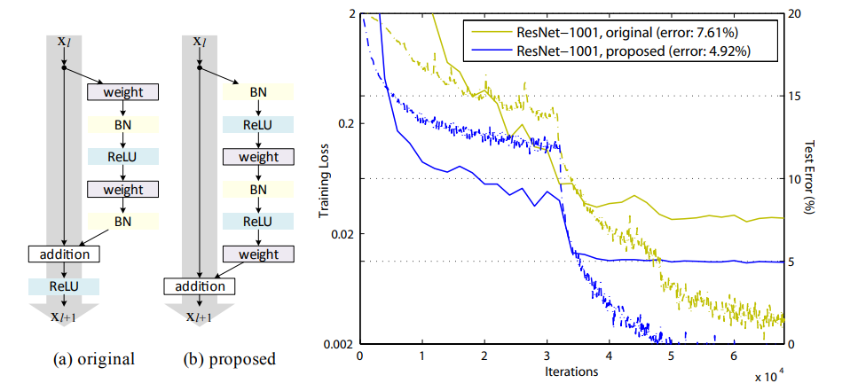 pre-activation 구조는 더해진 값이 ReLU 함수를 거치지 않아, 음수 값도 그대로 이용하게 된다. 실제로 학습 곡선을 살펴보면 제안된 구조가 초기 학습시에 loss를 더 빠르게 감소시킵니다.