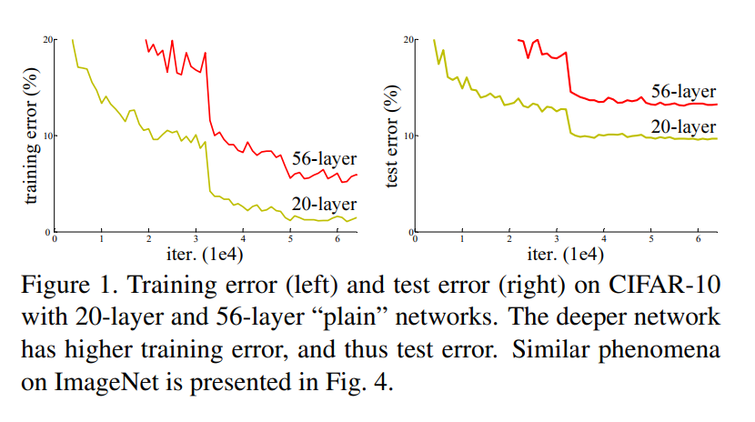 resnet 이전에 일반적인 cnn의 구조를 이용의 학습하면 어느정도 이상 깊어진 구조는 training error가 잘 줄지 않는 학습이 잘 되지않는 문제를 가지고 있었다 이에 논문의 저자들이 제안한 방법이