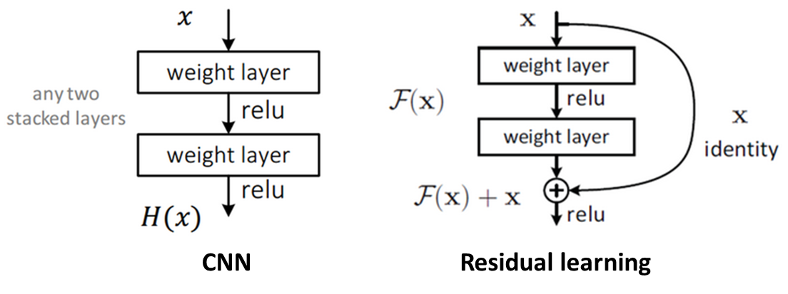 바로 H(x)를 학습하는 것은 어려우므로 대신 F(x) = H(x)-x 를 학습한다. H(x)는 현재 block을 거친 값이고 x는 그 전 까지의 값이니 결국 잔차(Residiual)를 가지고 학습을 했다는 것이다.