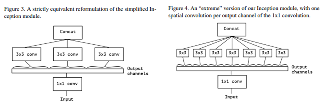 위에서 언급한 일반적인 버전의 inception 모듈의 1x1conv 를 하나로 합치고 3x3conv를 확장한 xception을 제안했다.